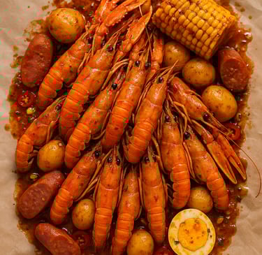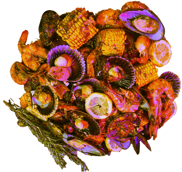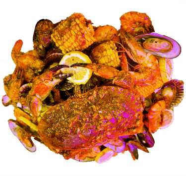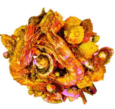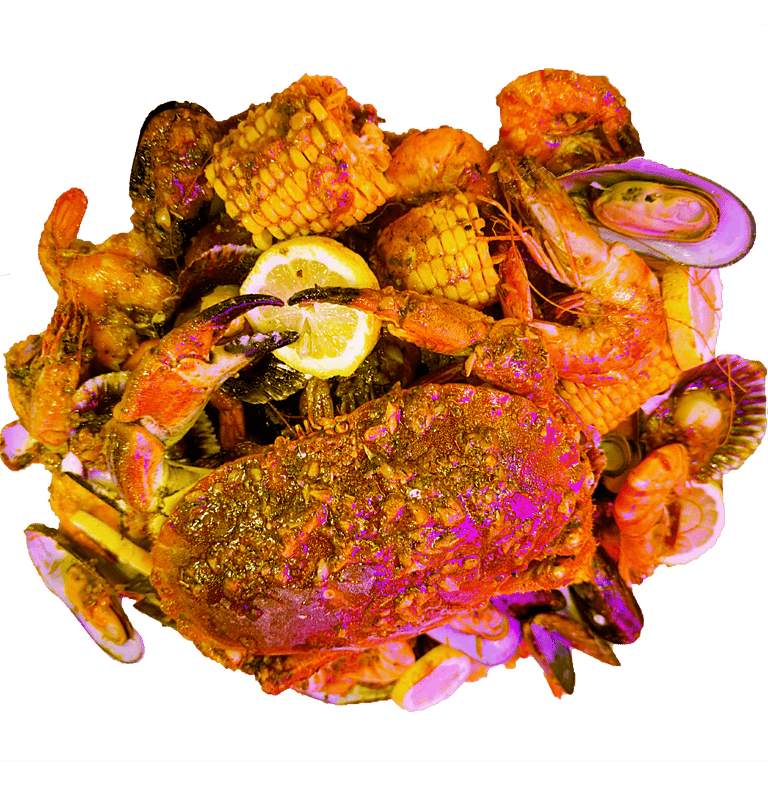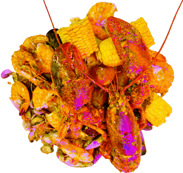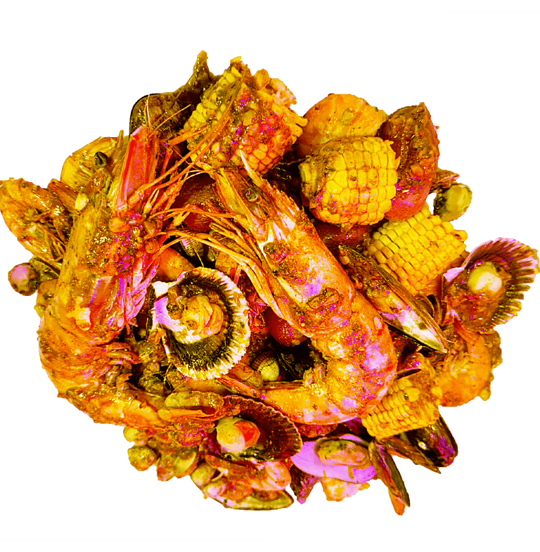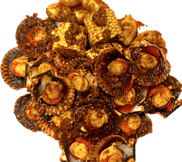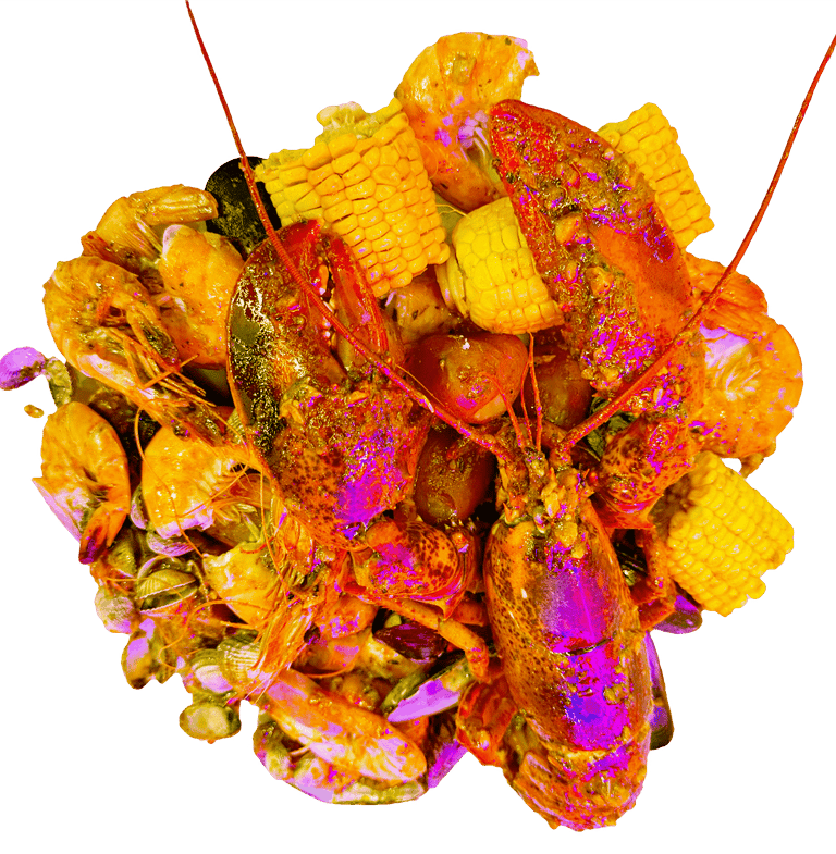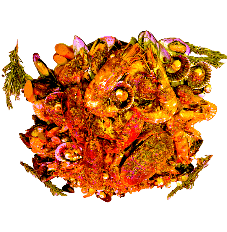 Homard, Gambas Black Tiger, Crabe arraigné à 4 pattes, Langoustine,Coquille St Jacques, Palourdes,Crevettes, Ecrevisses, Tourteau, Moules 1/2 coquilles. Servie avec maïs 8 pcs , saucisses de poulet 12 pcs, pomme de terre 8 pcs, frites et patates douces frits; Sauce et niveau de piment au choix.