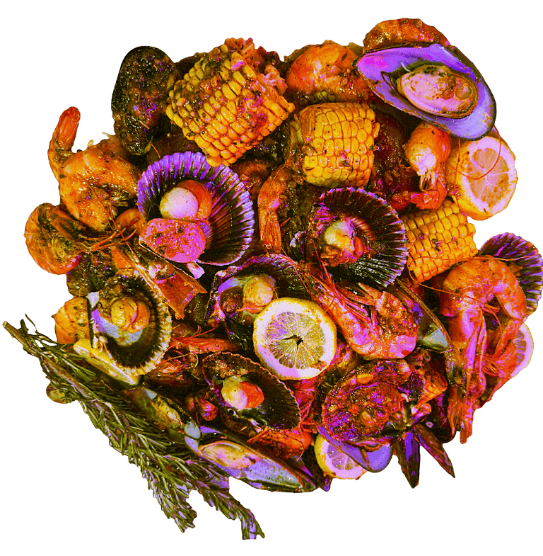 3 Fruits de mer au choix; maïs 4 pcs; saucisses de poulet 6 pcs (halal); pomme de terre 4 pcs; Sauce et niveau de piment au choix.